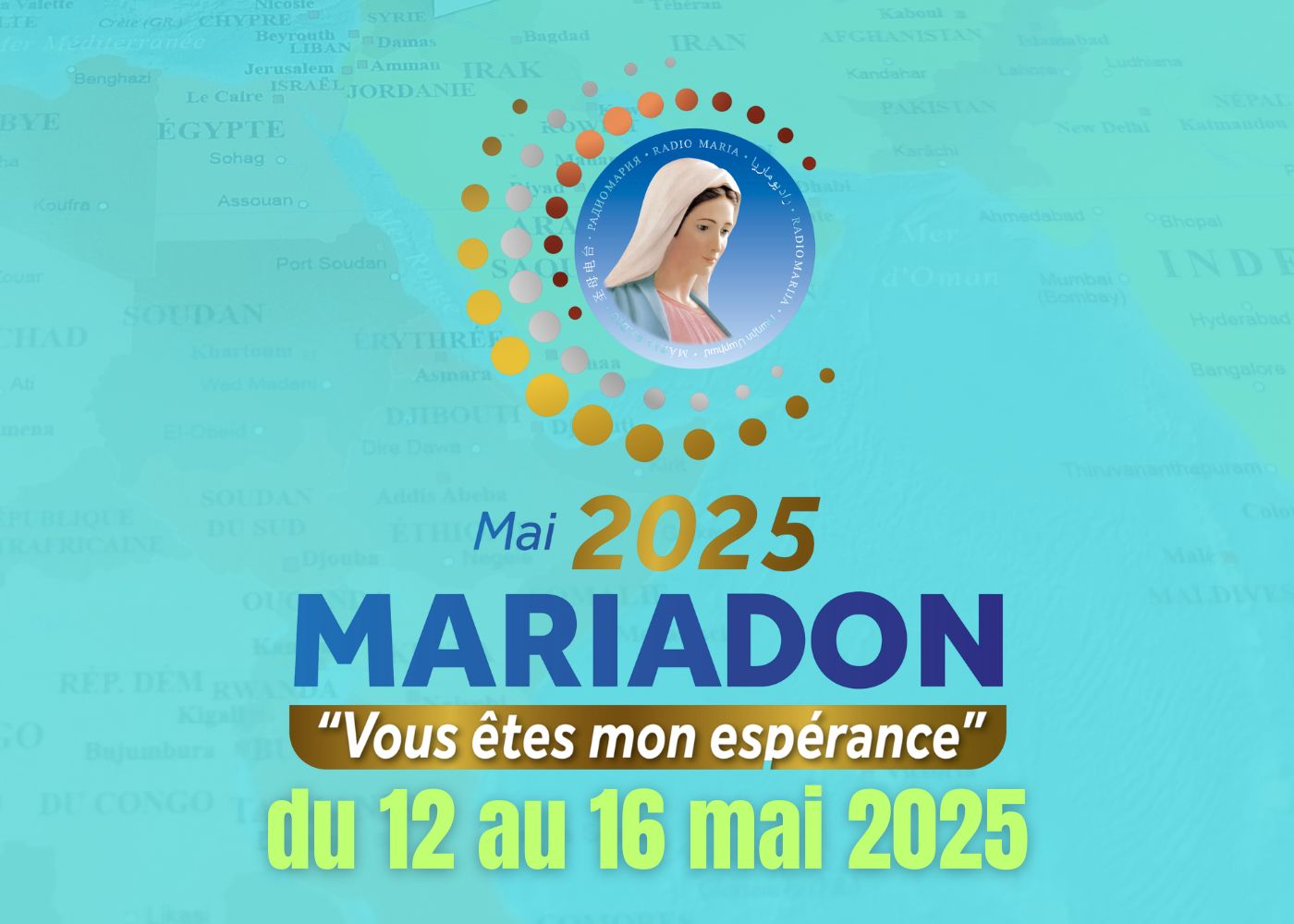 Le Mariadon, qui se tiendra cette année du 12 au 16 mai, est un formidable élan de solidarité, durant lequel les auditeurs se mobilisent généreusement pour permettre à Radio Maria de poursuivre sa mission d’évangélisation, en développant sa diffusion et en rejoignant toujours plus d’âmes en quête de Jésus. Le thème de cette année est : « Vous êtes mon espérance! »