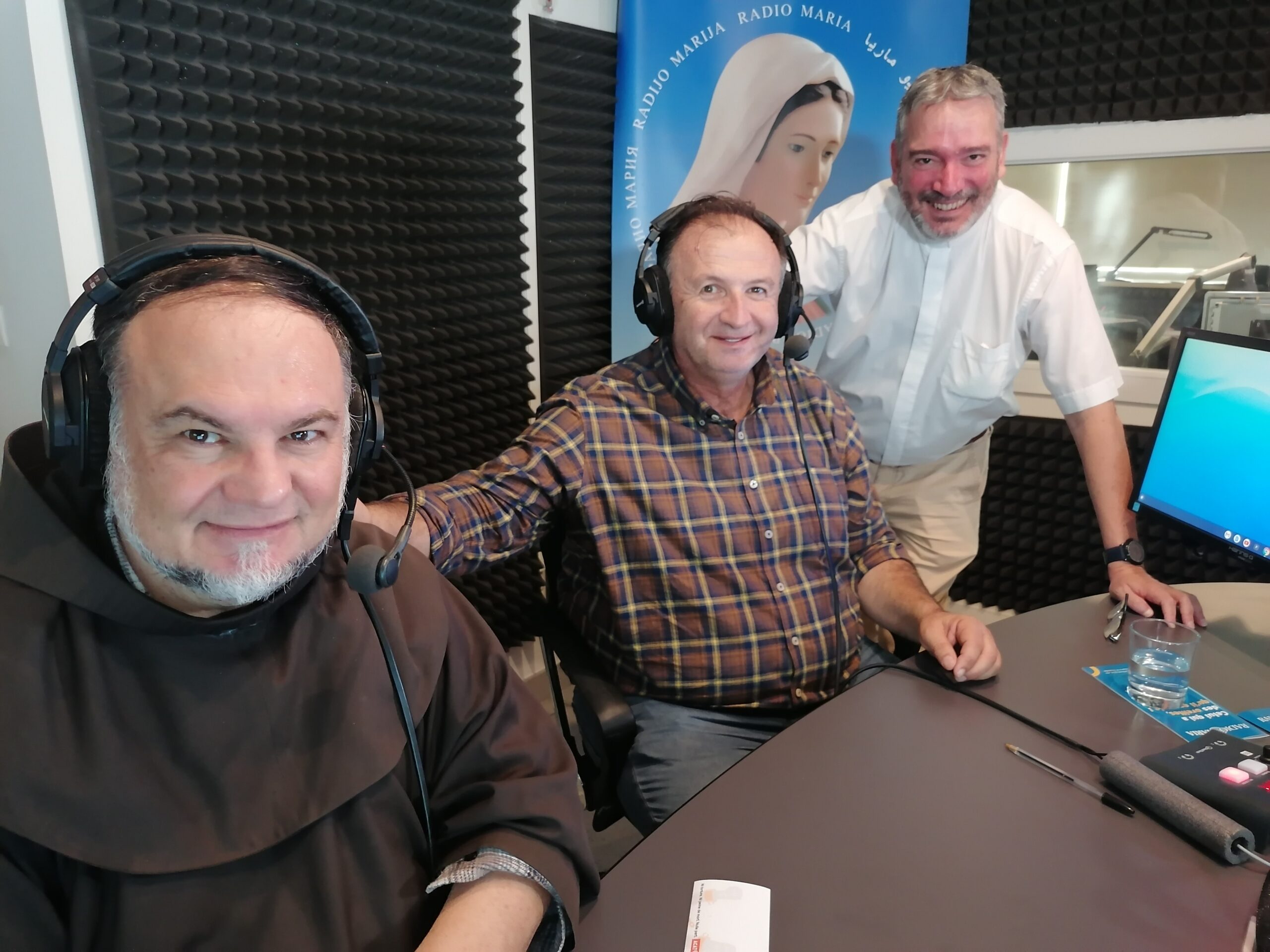 Grande joie ce matin, mercredi 2 octobre, aux studios de Radio Maria pour la visite du Père Boris Barun et du Frère Ciro de Medjugorje, accompagnés de Marjio Mijatovic, mari de la voyante Vicka. Ensemble, ils ont enregistré l’émission Medjugorje, le message, diffusée ce samedi 6 octobre (et chaque 1er samedi du mois en direct de Médjugorje) à 10h10.