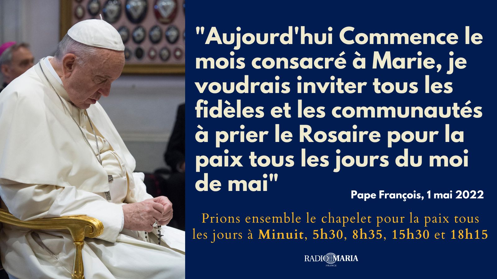 Radio Maria France, en communion, avec le saint-père et avec l’Eglise universelle, invite tous ses auditeurs et auditrices à prier le chapelet et à demander l’intercession de la Vierge Marie tous les jours sur le ondes de Sa Radio: à minuit, 5h30, 8h35, 15h30 et à 18h15.