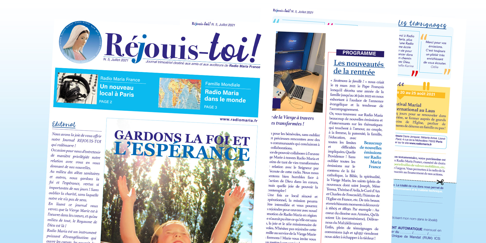 Nous avons la joie de vous offrir notre Journal « REJOUIS-TOI » qui redémarre ! Occasion pour nous d’entretenir de manière privilégiée notre relation avec vous en vous donnant de nos nouvelles. Au milieu des aléas sanitaires et autres, nous gardons la foi et l’espérance, vertus si importantes de nos jours ! Sans oublier la charité, sans laquelle notre vie n’a pas de sens. En lisant ce journal vous verrez que la Vierge Marie est à l’oeuvre dans les coeurs, et qu’au milieu de tout, le Royaume de Dieu est là !
