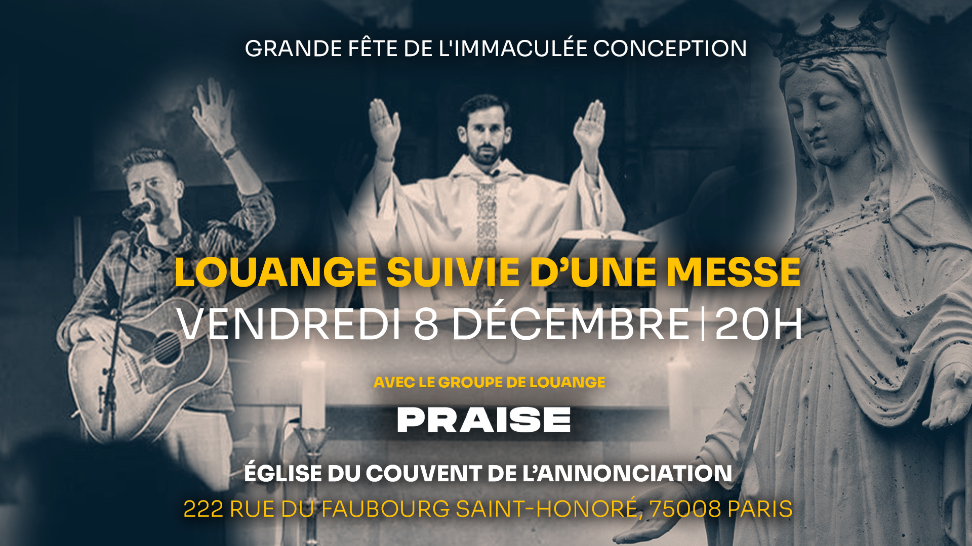 Veillée mariale de l’Immaculée Conception avec le frère Paul-Adrien depuis l’église du Couvent de l’Annonciation (222 Rue du Faubourg Saint-Honoré, 75008 Paris) en direct sur Radio Maria le vendredi 8 décembre à partir de 20h00 ! Au programme louange animée par le groupe de louange Praise avec évangélisation de rue, messe de la solennité de l’Immaculée Conception et temps convivial.